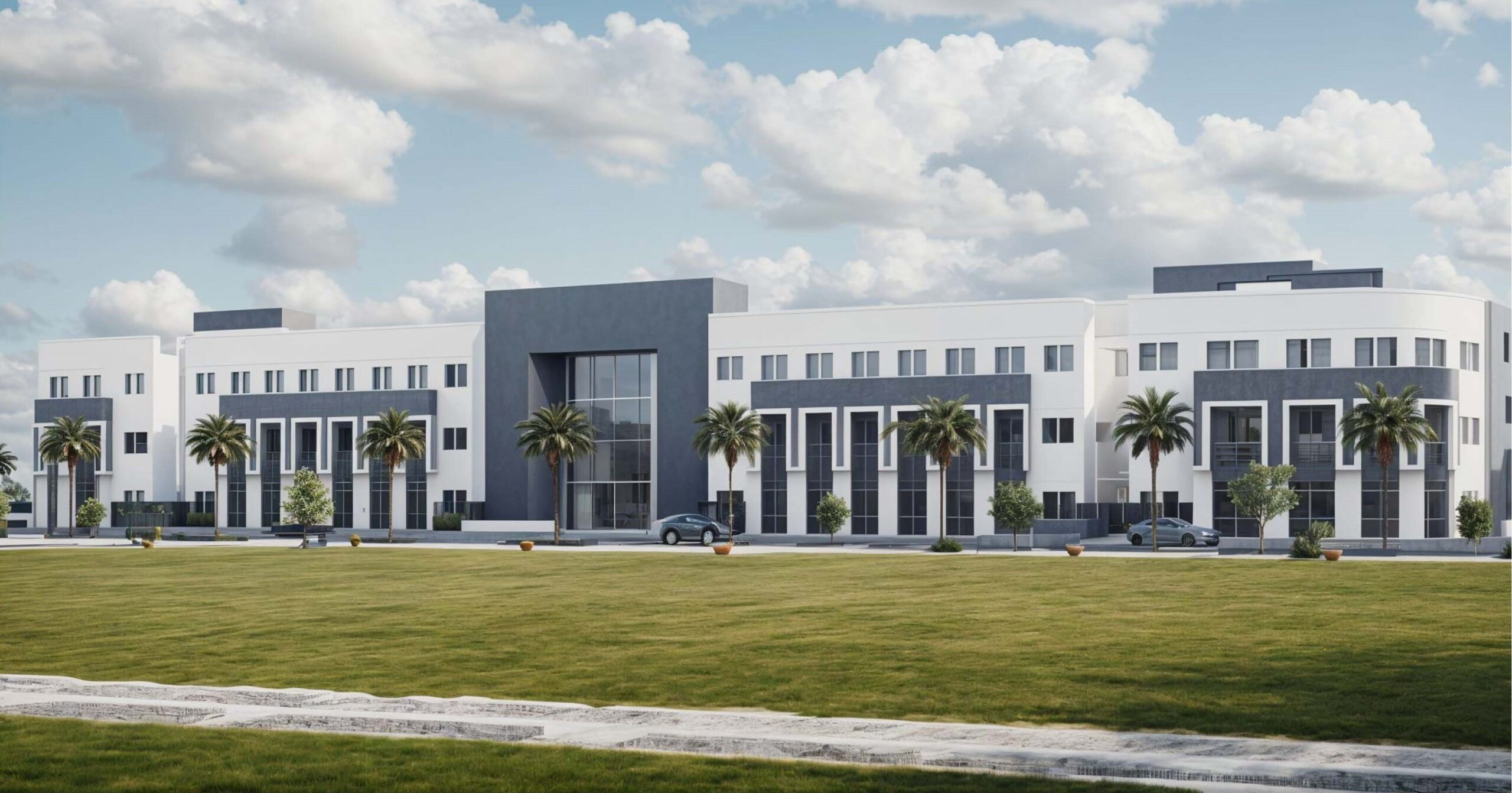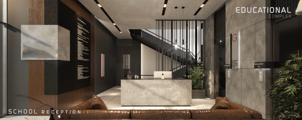The complex includes fully equipped sports fields, expansive green areas, and thoughtfully integrated landscape elements, creating an attractive and functional learning environment.